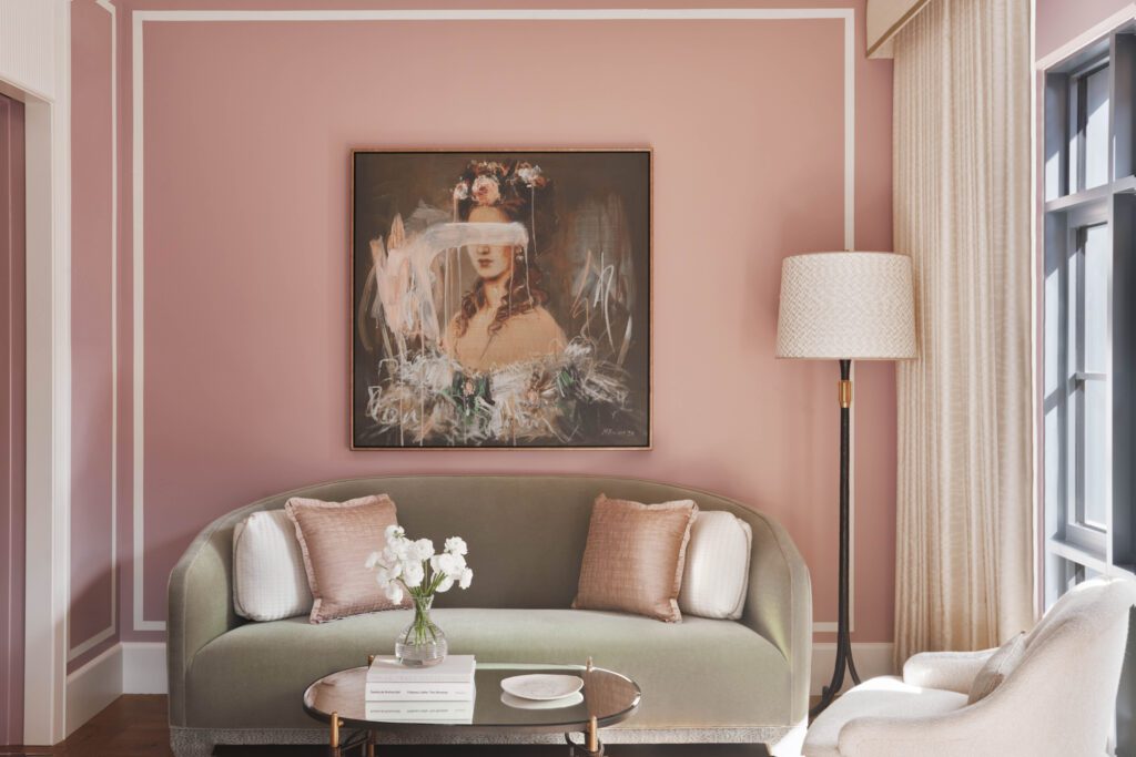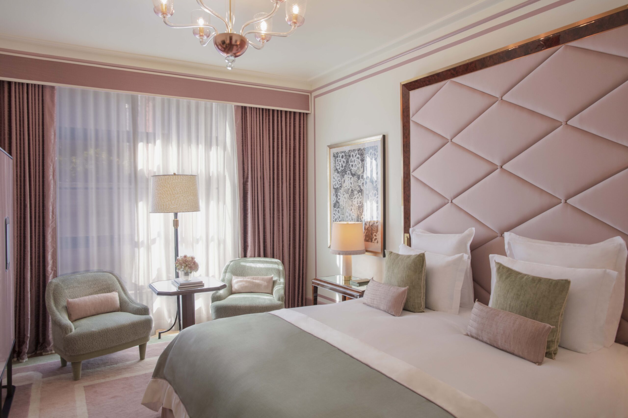 Awash in shades of rose petal, lavender and pistachio, Brudnizki’s color palette was inspired by Ladurée macarons, and they do, indeed, feel like stepping inside a box of confections. Categorically spacious and sumptuously textured with lacquered credenzas, Venetian glass chandeliers and tufted headboards that run up to the ceiling, the aesthetic is a blend of classical and Art Deco, freshened up with modern pastel shades. Enormous picture windows invite the city in with neighboring brick walls casting a complimentary rosy hue onto the scene.