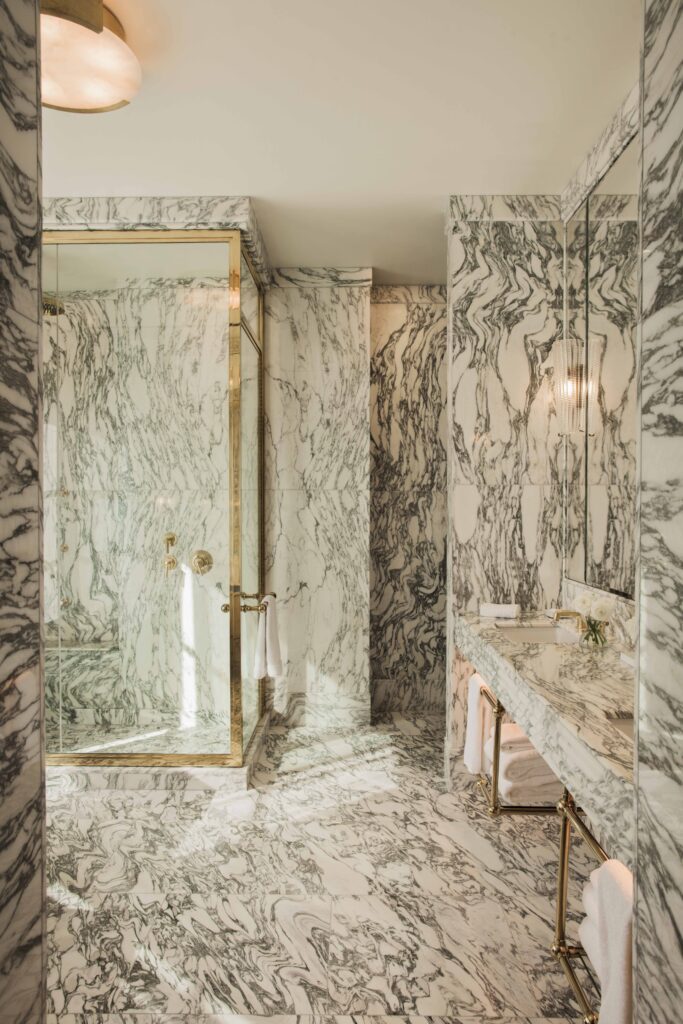 Bathrooms are luxurious in deeply veined Carrara marble, featuring playful “Toile de Jouy” wallpaper with illustrations of Lower Manhattan icons, from the Statue of Liberty to the Odeon, for a playful melding of Paris and New York sensibilities. Suites feature (my favorite) Toto toilets.
