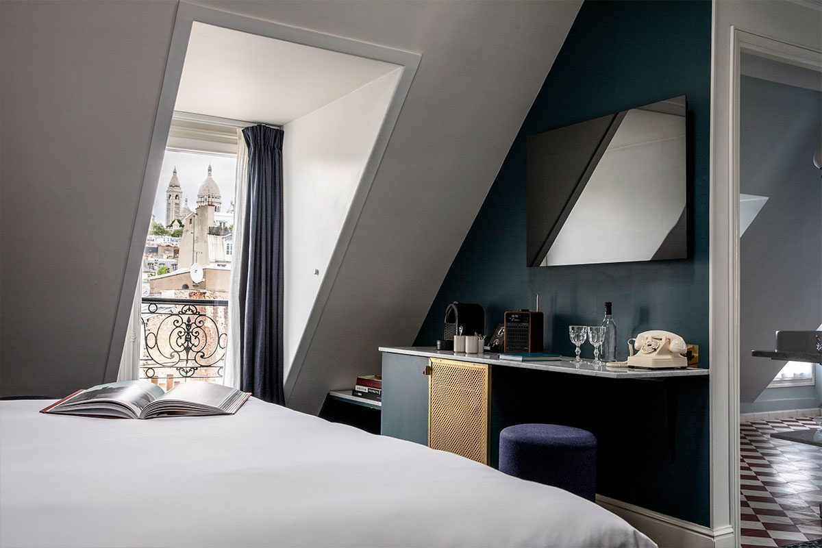 Grand Pigalle is a boutique hotel in the true sense of that term. There are really no amenities to speak of. Hospitality is warm and gracious. I checked in twice in the last year and on each of my visits, my room was ready before the official check-in time and I was told I’d been upgraded. Up the lift, inside my room on a high floor, I was greeted with a handwritten welcome note and further delighted by views of the tip-top of Sacré-Coeur above the roofline from my private Juliet balconies. And yes, I squealed in delight à la Carrie Bradshaw both times!