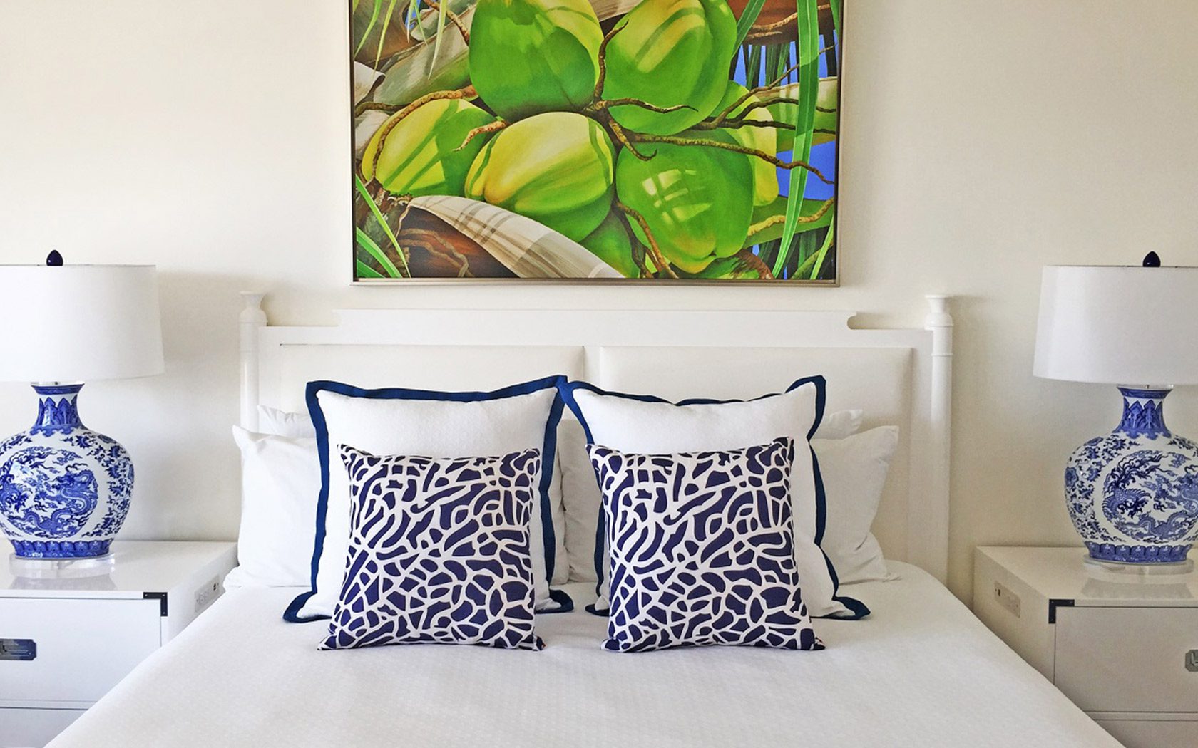 Every guest room boasts balconies overlooking the marina and the open ocean. Standard rooms are spacious in crisp white with punches of deep blue found in accent pillows, diamond-patterned carpeting and porcelain, chinoiserie-like bedside lamps. A wooden entertainment console is painted white with louvered doors housing a flat screen TV, as well as local objets d’art and books, while a painting of young green coconuts adds a pop of color. Bathrooms are modern and roomy with glass-enclosed showers and white subway tiles. Individual rooms can also be combined to create two-bedroom suites.